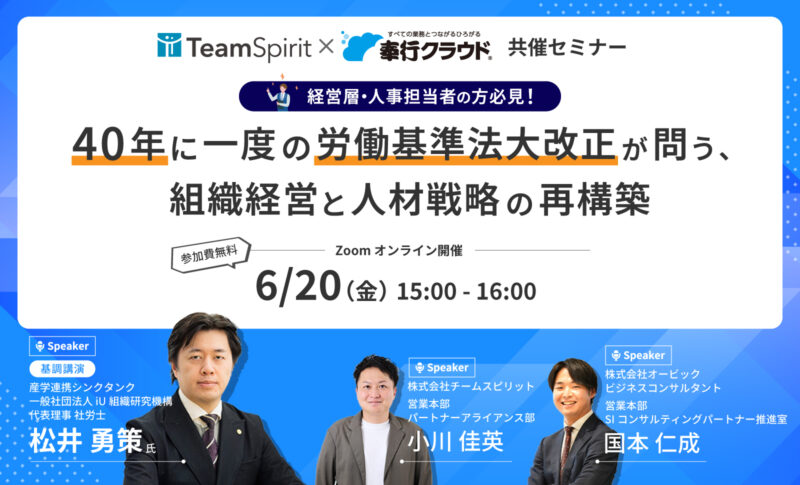 本セミナーにおいてご提供いただいた個人情報は、参加者への連絡、セミナーの運営及び関連する情報提供を目的として利用いたします。株式会社オービックビジネスコンサルタント、株式会社チームスピリット、株式会社ケイズコーポレーションは、参加者の皆様の個人情報を適切に管理し関係法令および各社の社内規程を遵守いたします。
