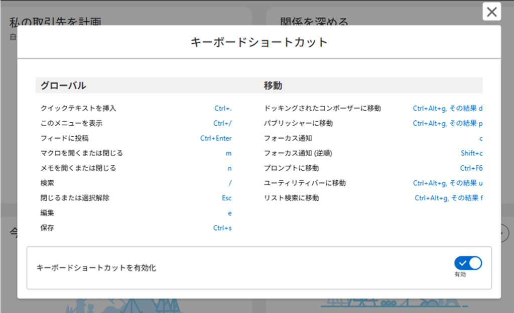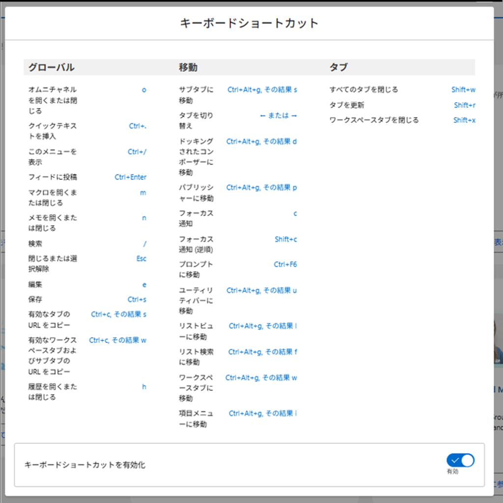 使用できるショートカットの一覧と、キーボードショートカットを有効化するためのチェックが表示されます(Lightning環境で利用できるキーボードショートカットとなります)。
