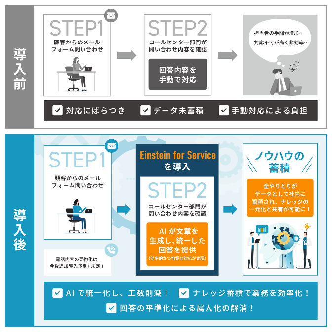 そこで、Einstein for Serviceを導入しました。これにより、AIが対応時の文章作成を代行し、担当者の手間を大幅に削減しました。さらに、コールセンター内で得られたデータを社内の知識として共有できるようになり、業務全体が効率化されました。
