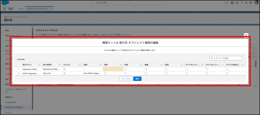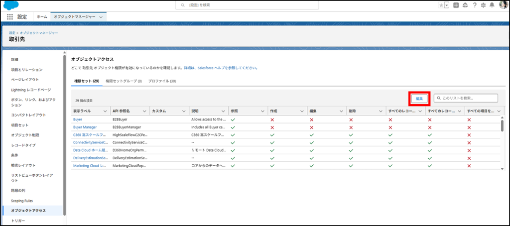 [編集]ボタンから、権限セットおよびカスタムプロファイルのオブジェクト権限を変更することも可能です。