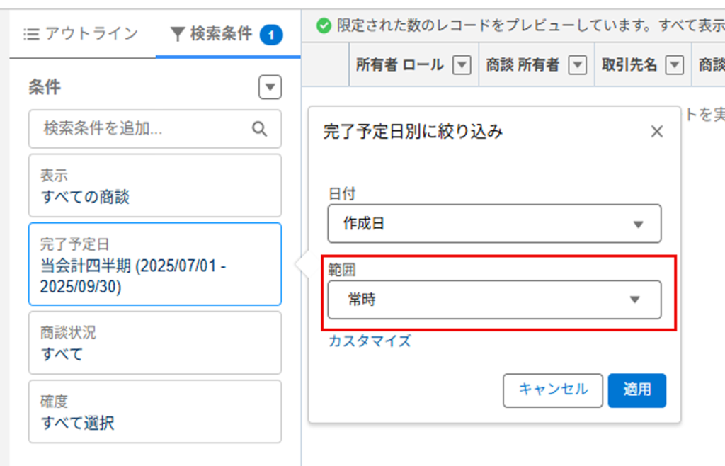 まず、レポートの日付条件でデフォルト設定されている日付を「常時」に変更します。