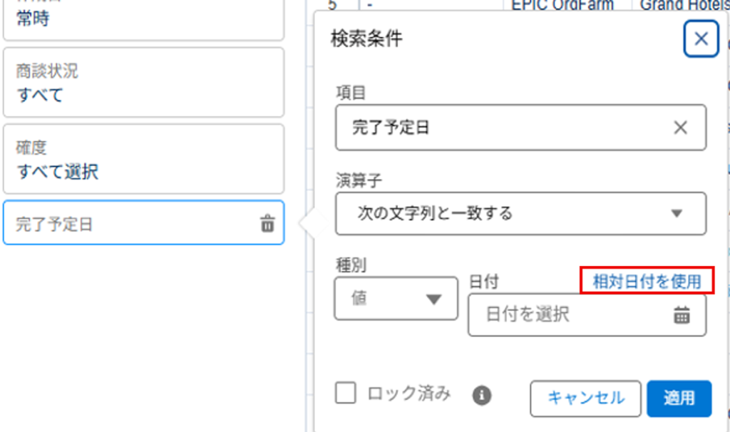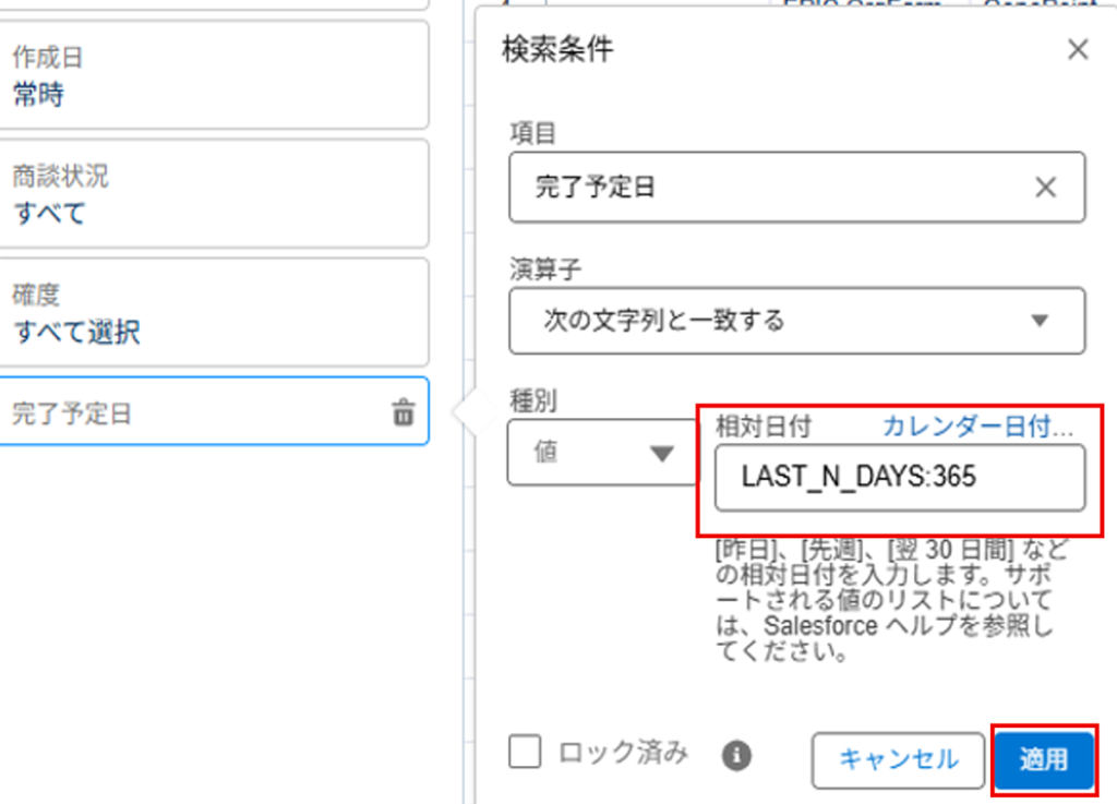 追加した日付項目の条件で、「相対日付を使用」を選択します。
