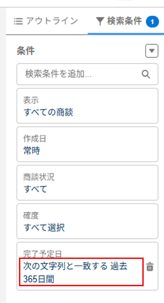つぎに、「検索条件を追加」からレポートに使用したい任意の日付項目を選択し、条件に追加します。